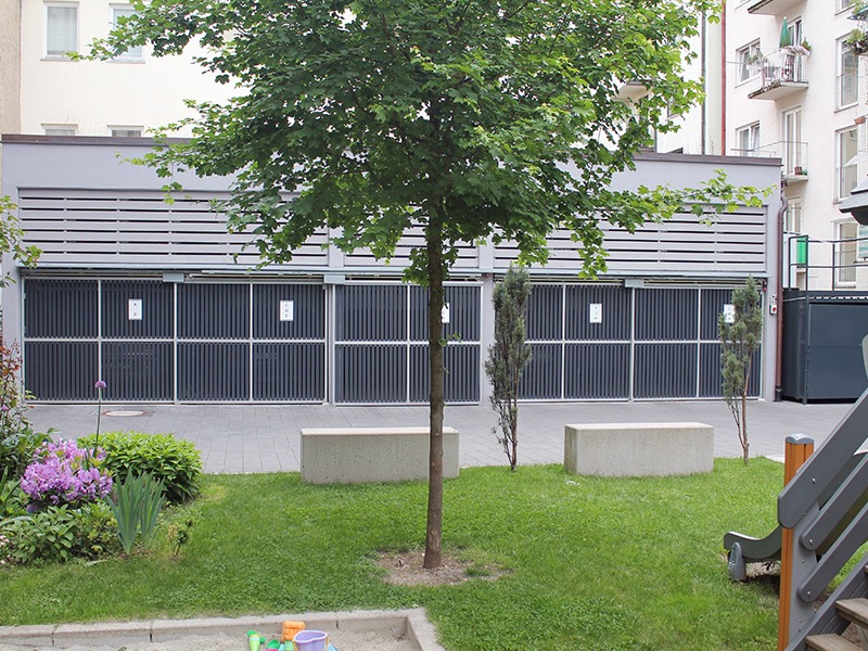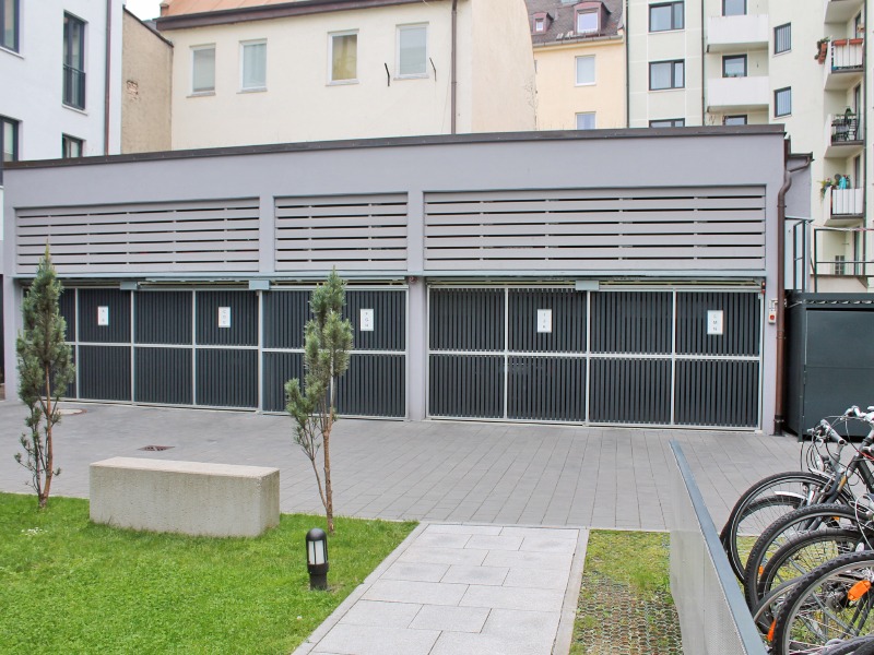 In the courtyard of a newly built residential building near Gärtnerplatz in Munich, 14 additional parking spaces were created by installing the parking system Uniparker N5303 enabling parking on 3 levels.
